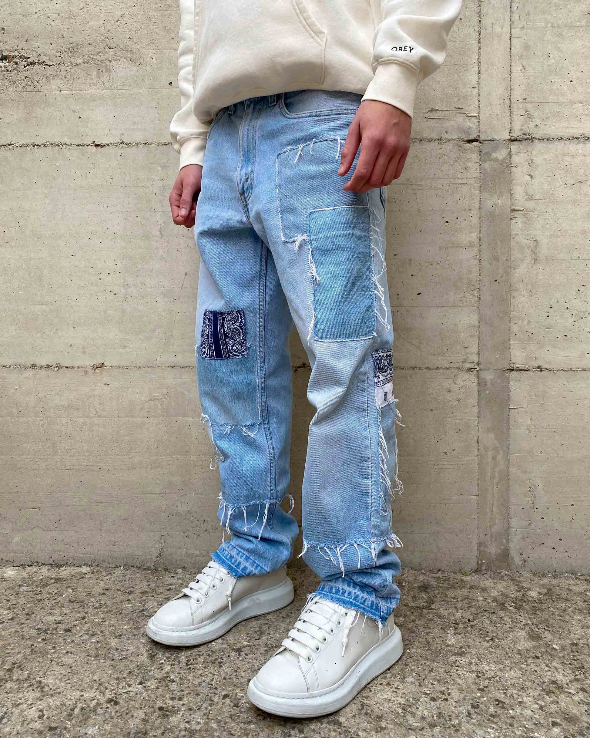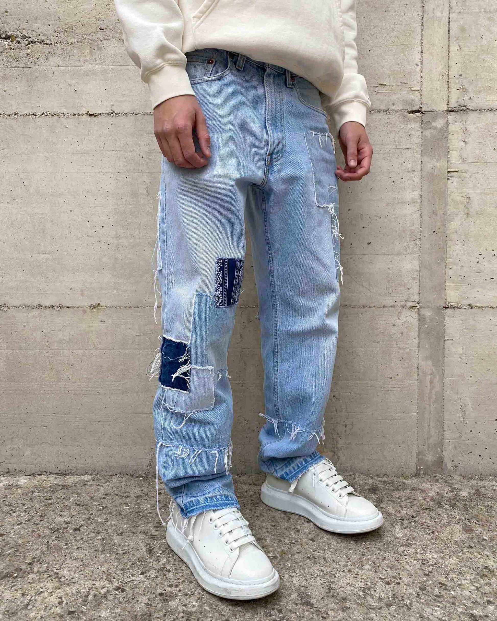 Lavorazioni eseguite su jeans Levi's vintage selezionato a mano. Custom caratterizzato da patch in denim di recupero e bandana blu in 100% cotone di alta qualità.