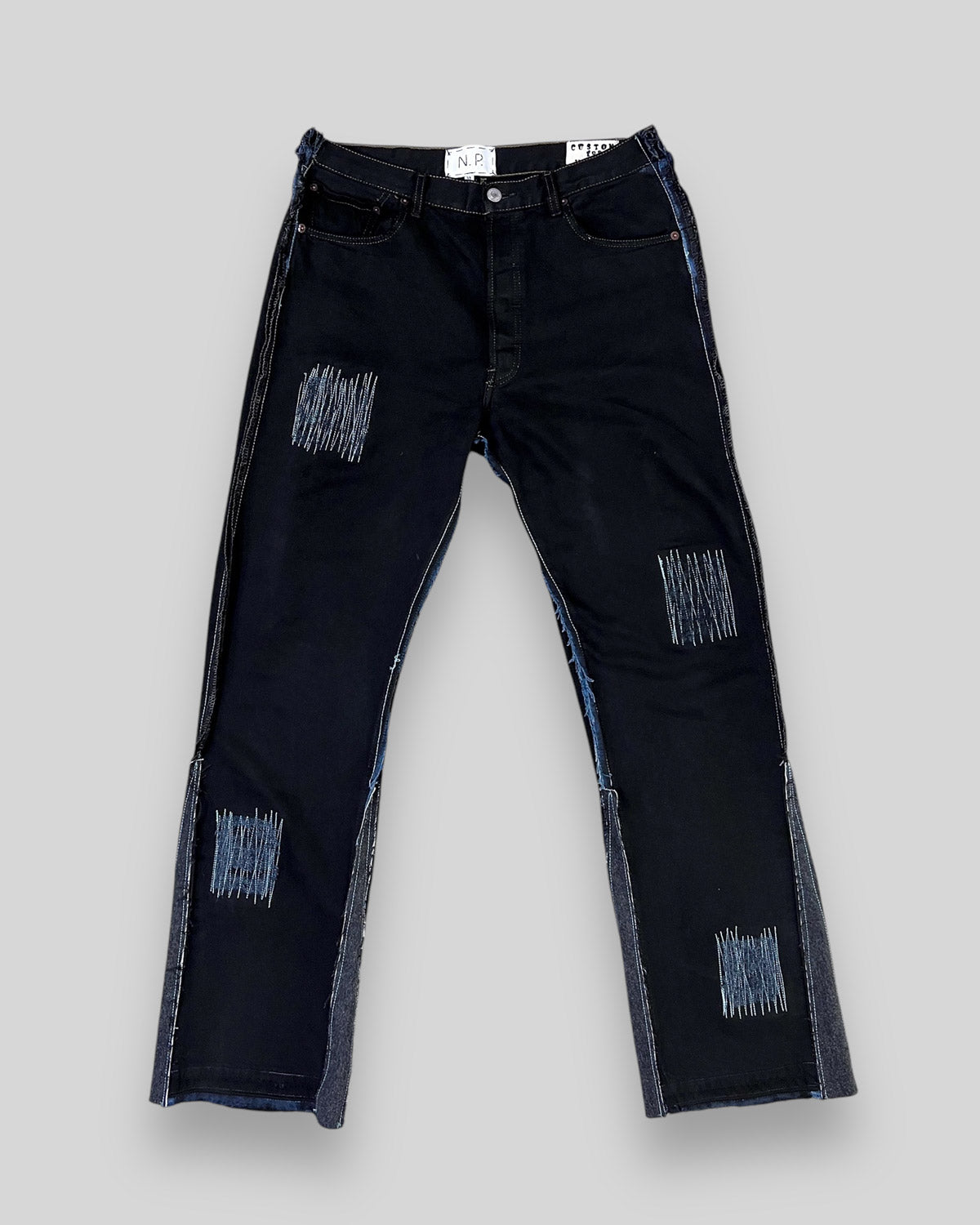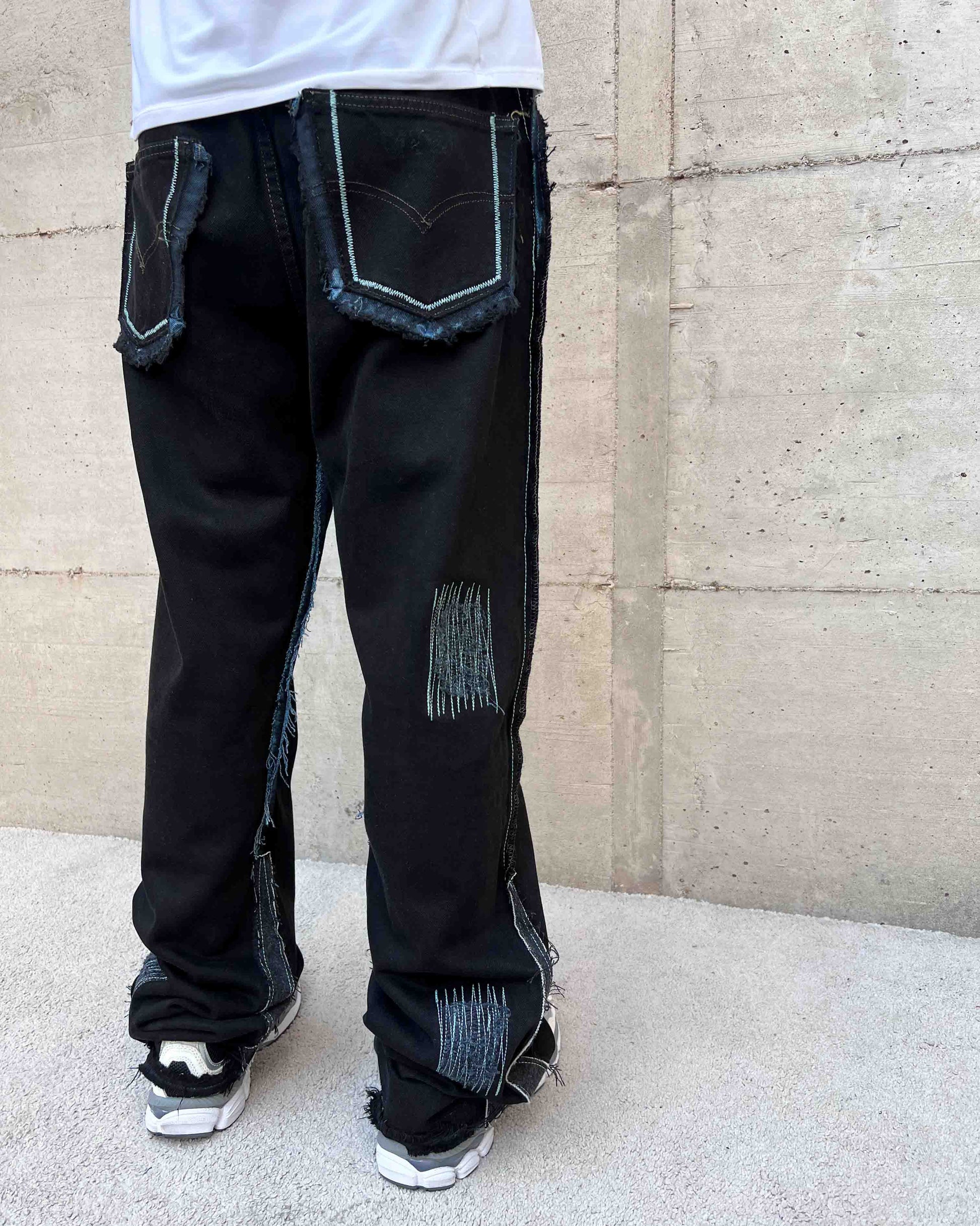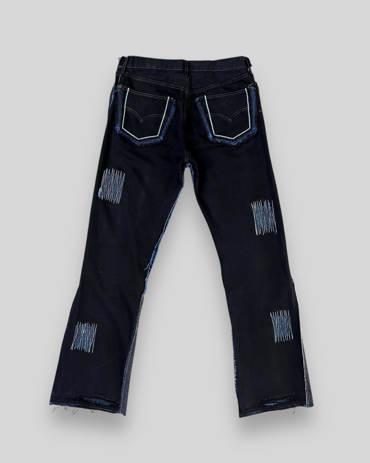 Lavorazioni eseguite su jeans Levi's vintage selezionato a mano. Custom diviso a metà e ricucito a taglio vivo per un effetto sprefilato.
