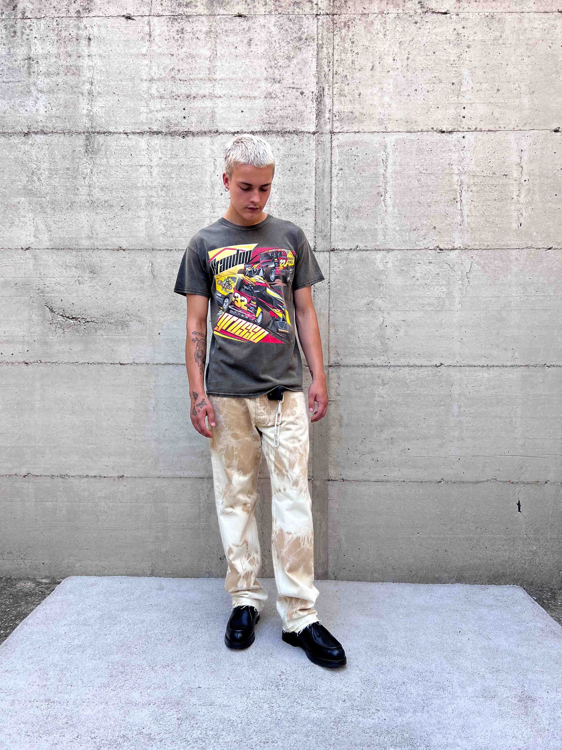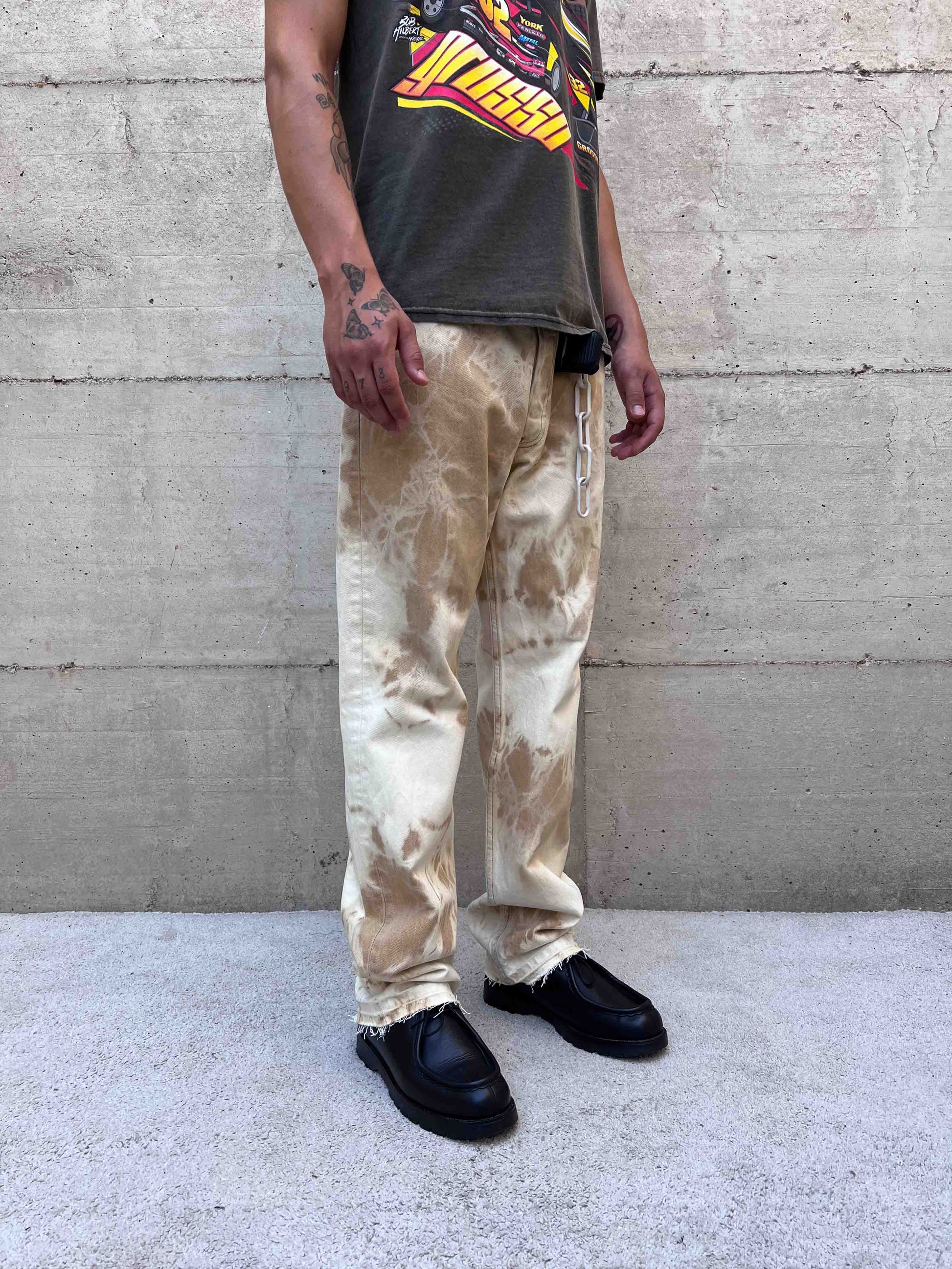 Originariamente in lavaggio beige, ho eseguito una lavorazione bleach creando questo pattern inedito su tutta la superficie del denim.