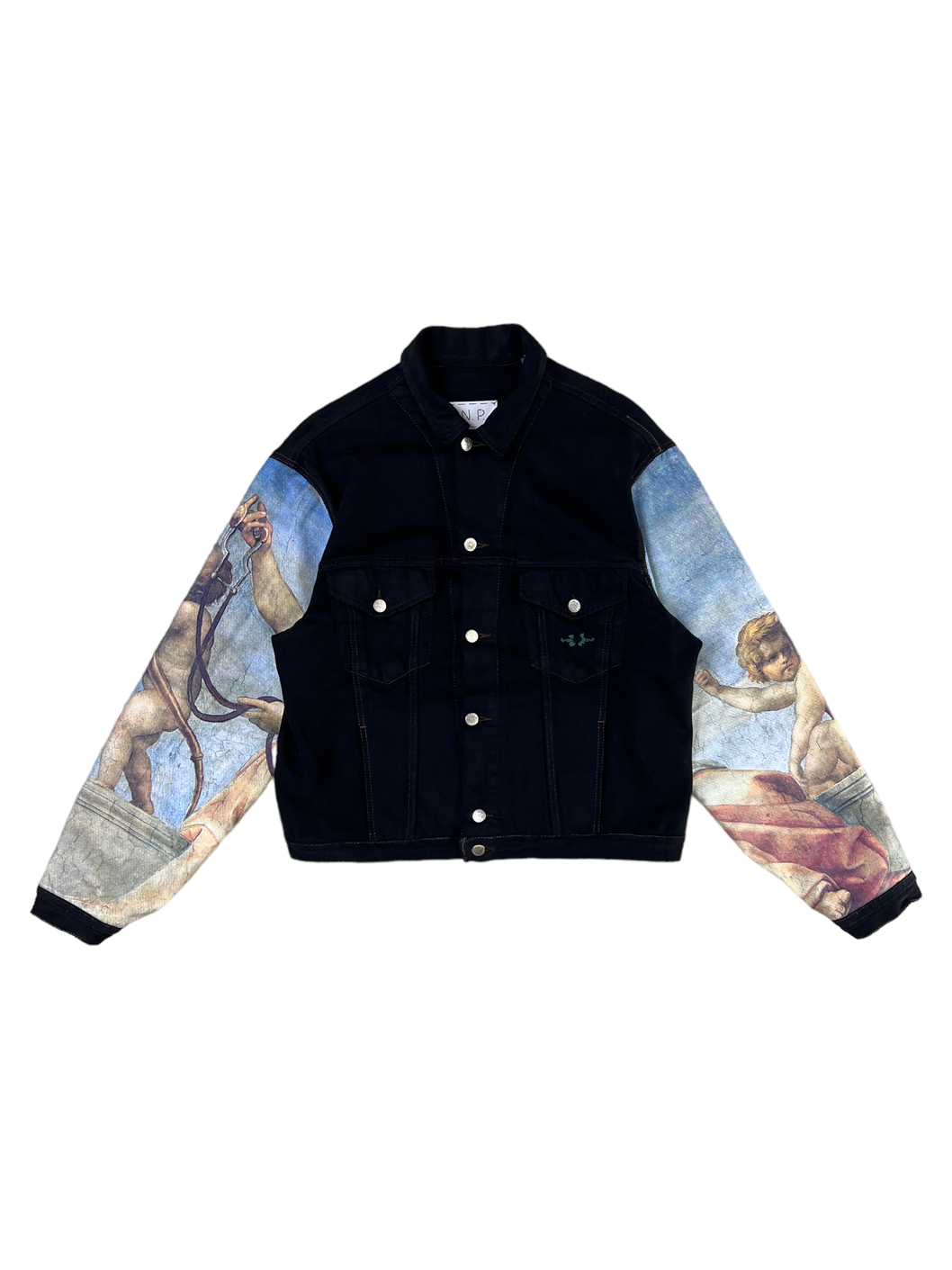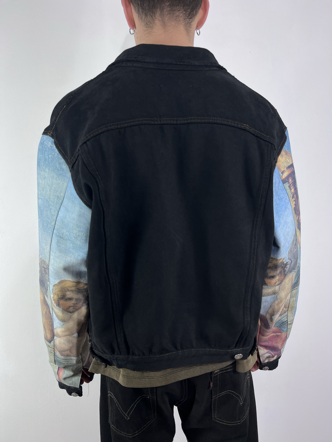 Jacket in jeans vintage che ho rielaborato ricostruendo le maniche con un particolare dell affresco di Raffaello, "Virtù e la legge" che si trova all'interno delle stanze vaticane.