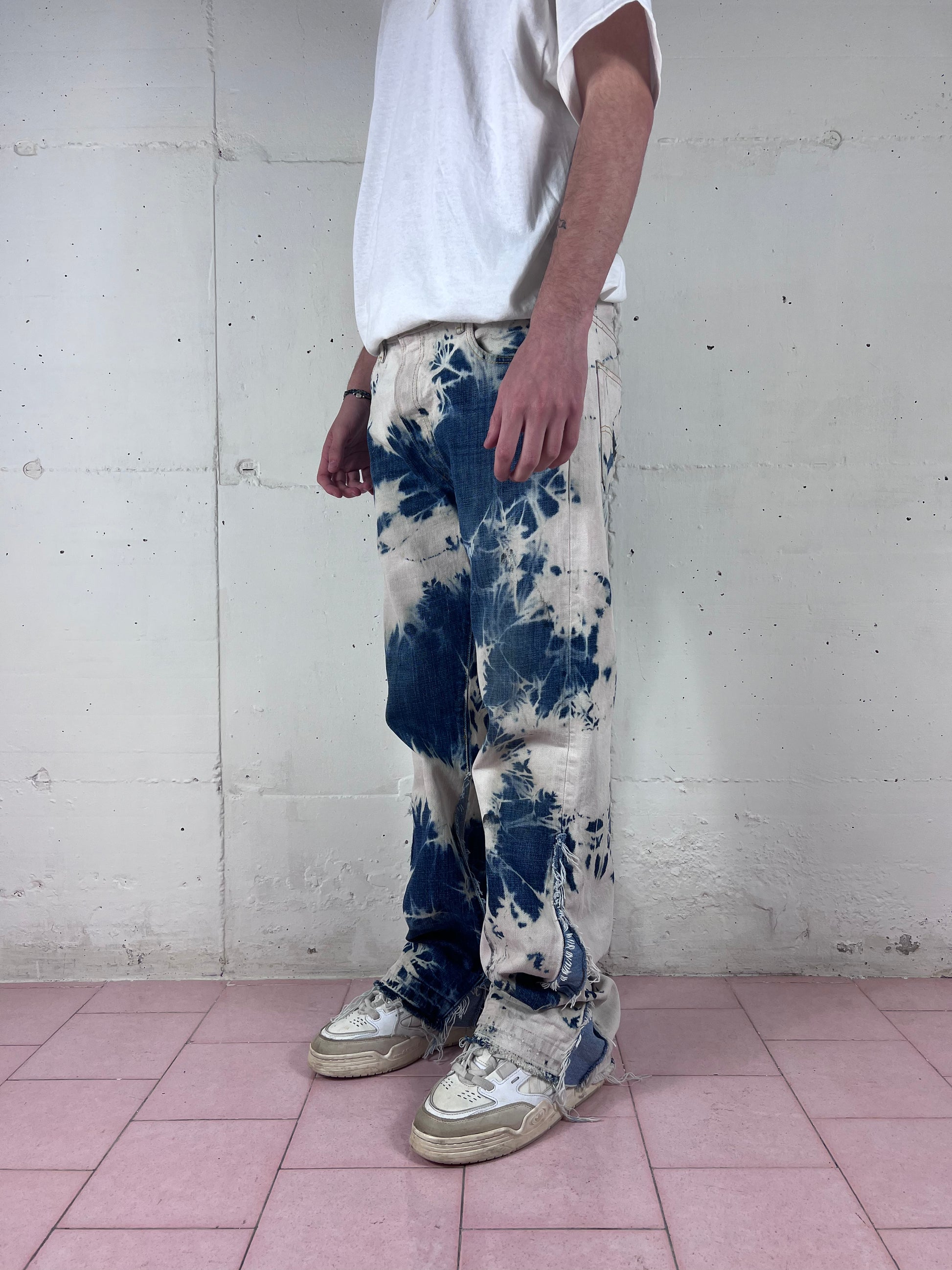 Originariamente in lavaggio blue jeans, ho eseguito una lavorazione bleach creando questo pattern inedito su tutta la superficie del denim.