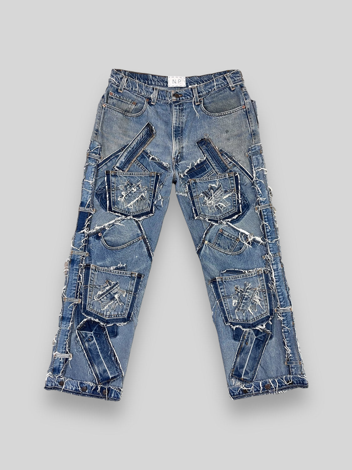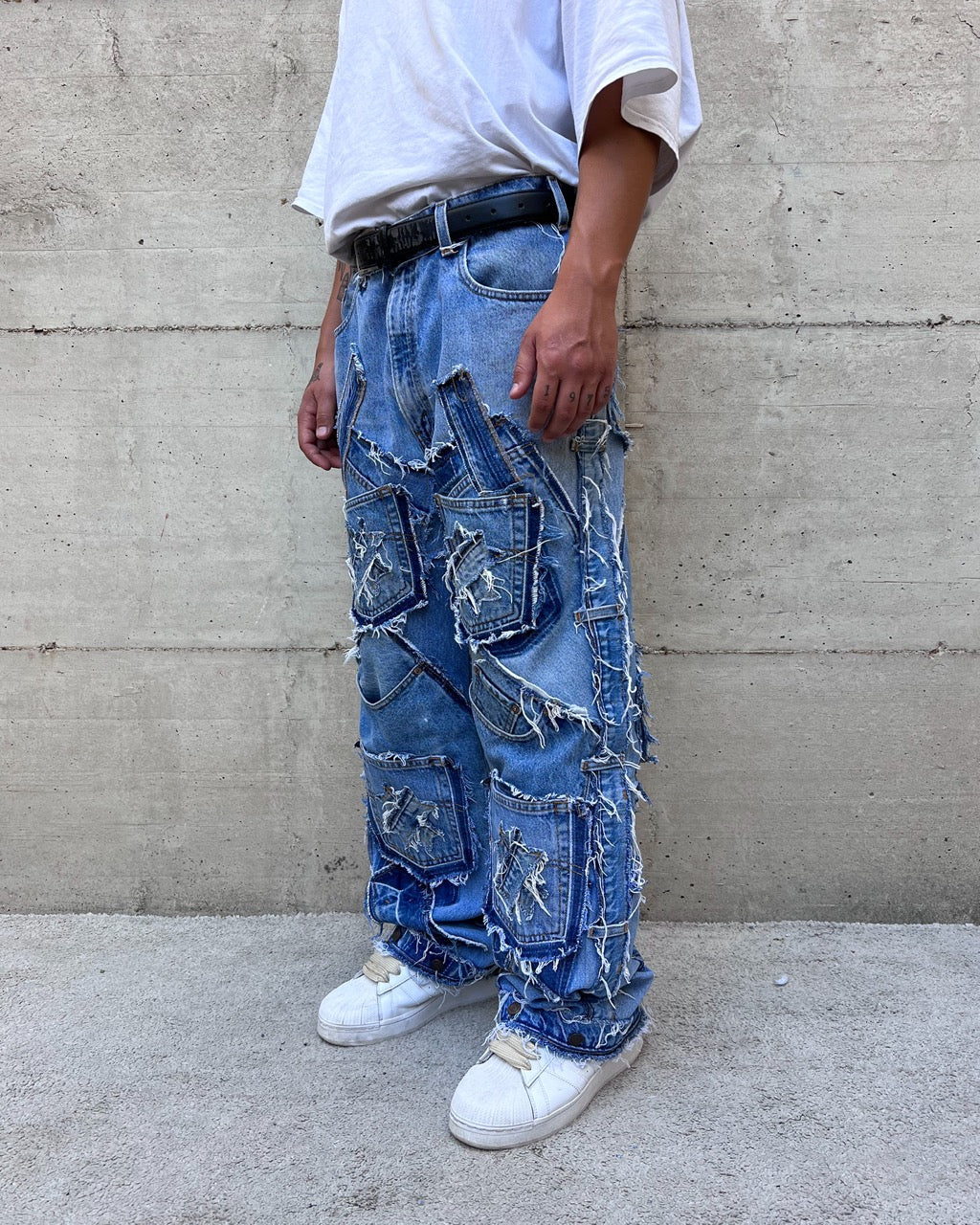 Lavorazioni eseguite su jeans Levi's vintage selezionato a mano. Custom caratterizzato da parti precise di altri jeans vintage inutilizzabili singolarmente e cucite a pattern su tutto il pantalone.