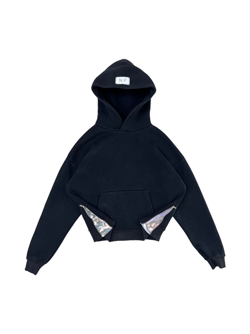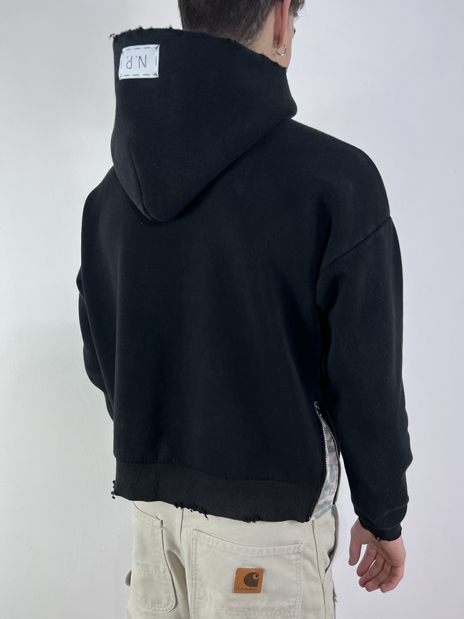 Ho rielaborato questa hoodie second-hand inserendo ai lati due zip con all' interno un particolare de "Il Giudizio Universale" di Michelangelo.