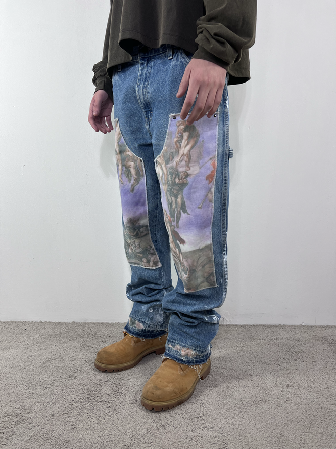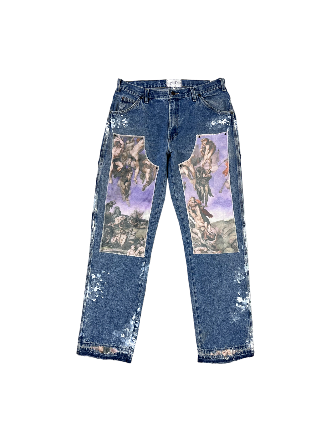 Ho rielaborato questo Dickies vintage creando due patch double knees raffiguranti "il giudizio universale" di Michelangelo.