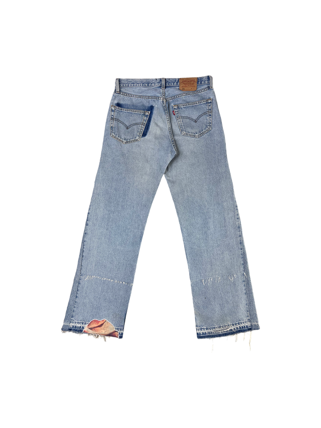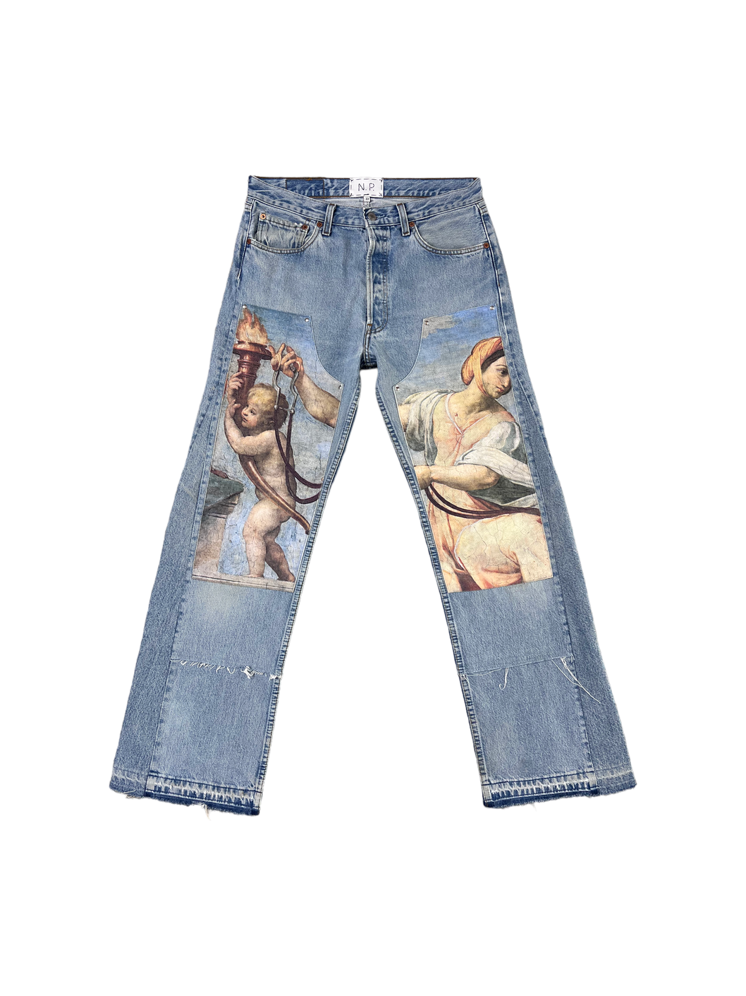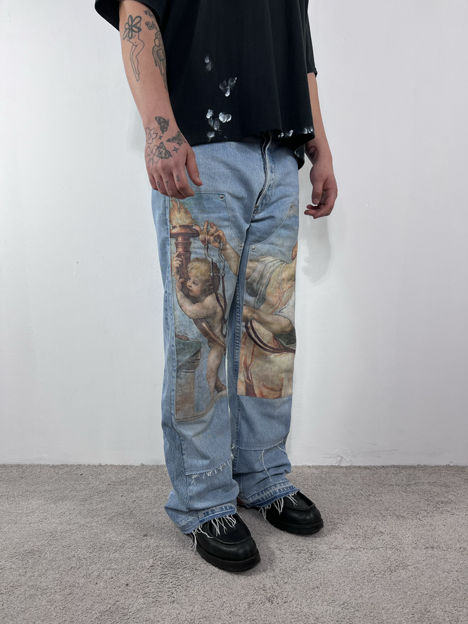 Tutto è iniziato dall immortale affresco di Raffaello, "Virtù e la legge" che si trova all'interno delle stanze vaticane. Io ne ho preso un particolare e ci ho rielaborato questo jeans Levi's vintage.