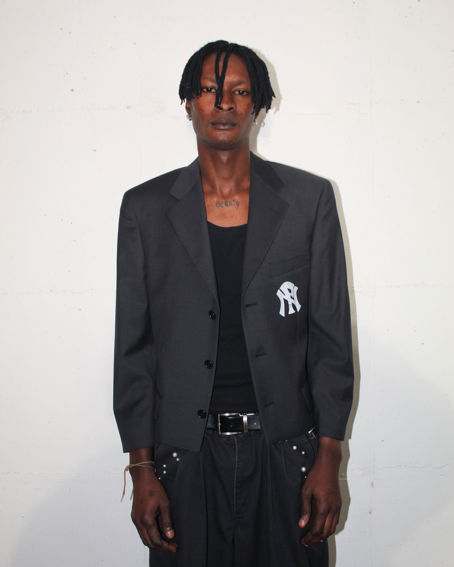 Blazer vintage selezionato a mano. Capo trasformato rendendo il fit boxi a taglio vivo e rifinito con la stampa NPNY realizzata con colore bianco da tessuto.