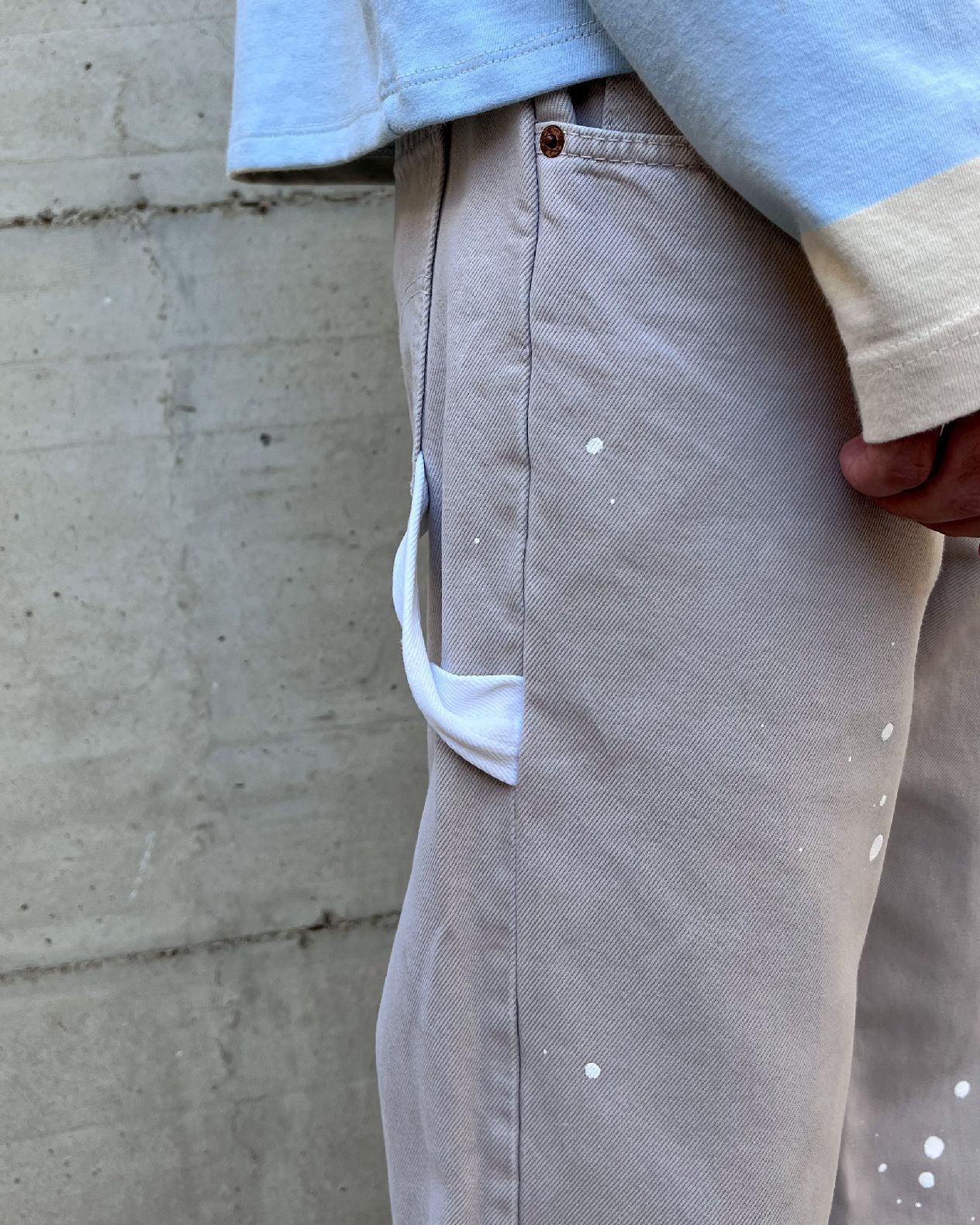 Inoltre, con il jeans di recupero bianco, ho creato un laccetto posteriore. Classico elemento dei panta carpenter.
