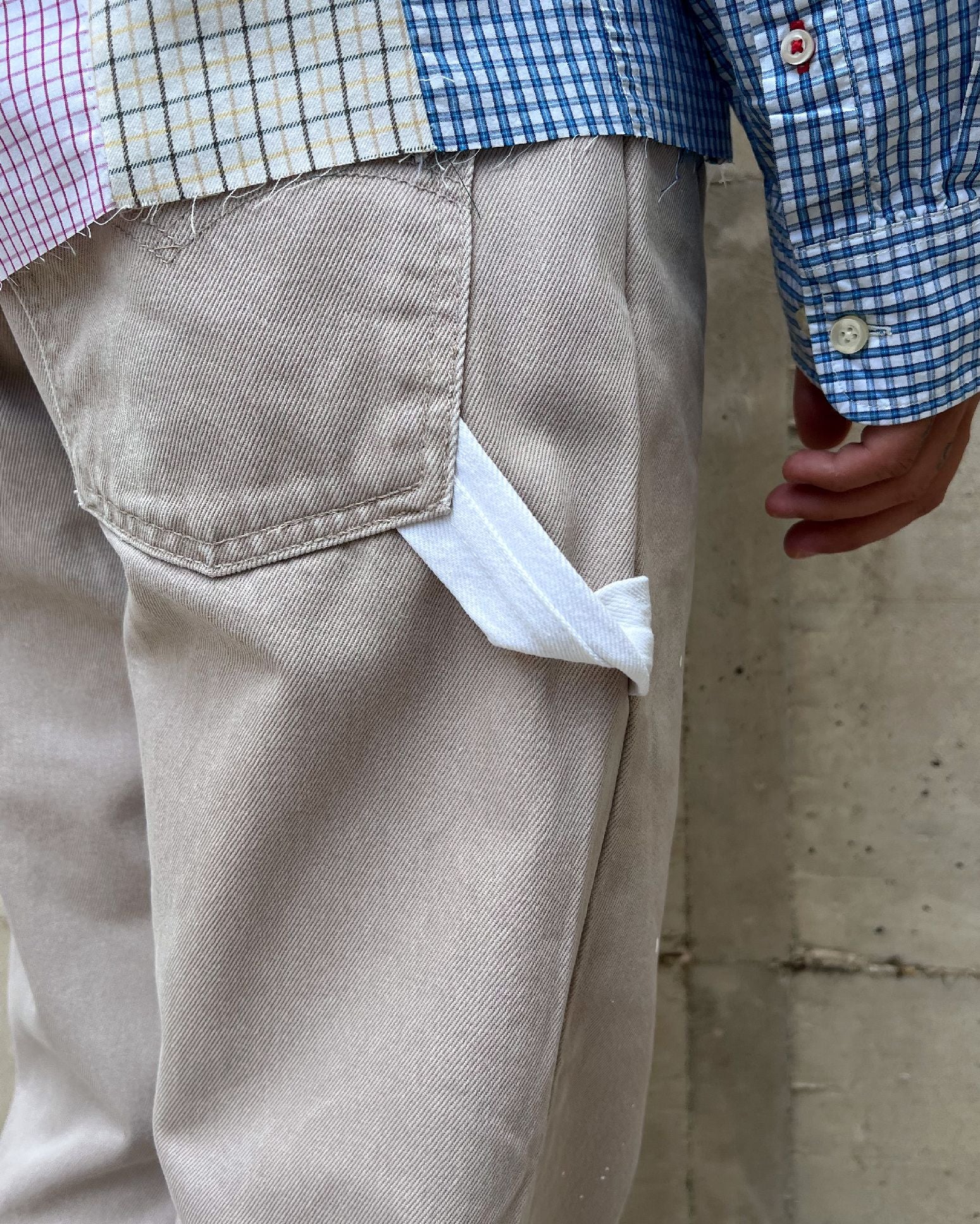 Inoltre, con il jeans di recupero bianco, ho creato un laccetto posteriore. Classico elemento dei panta carpenter.