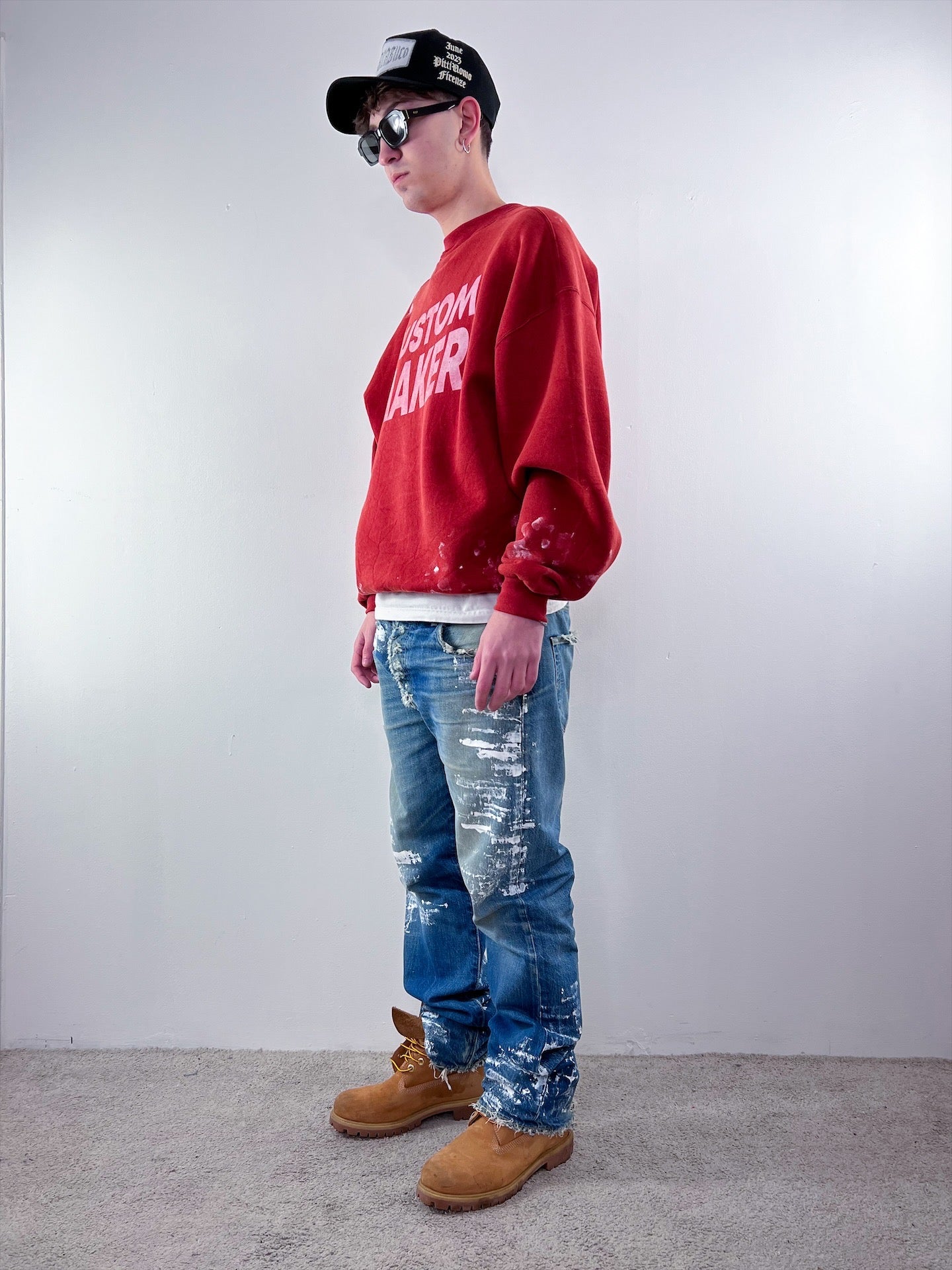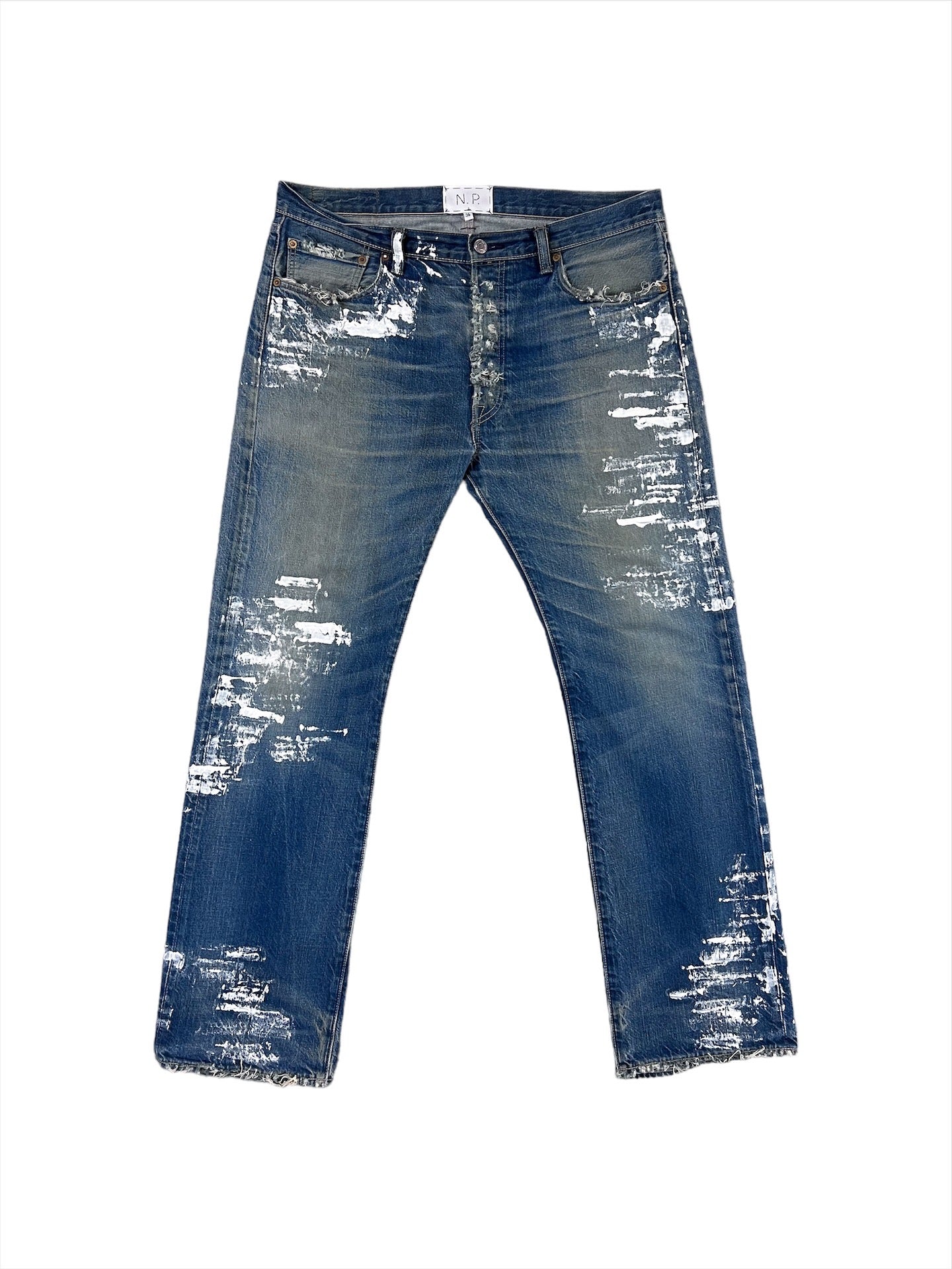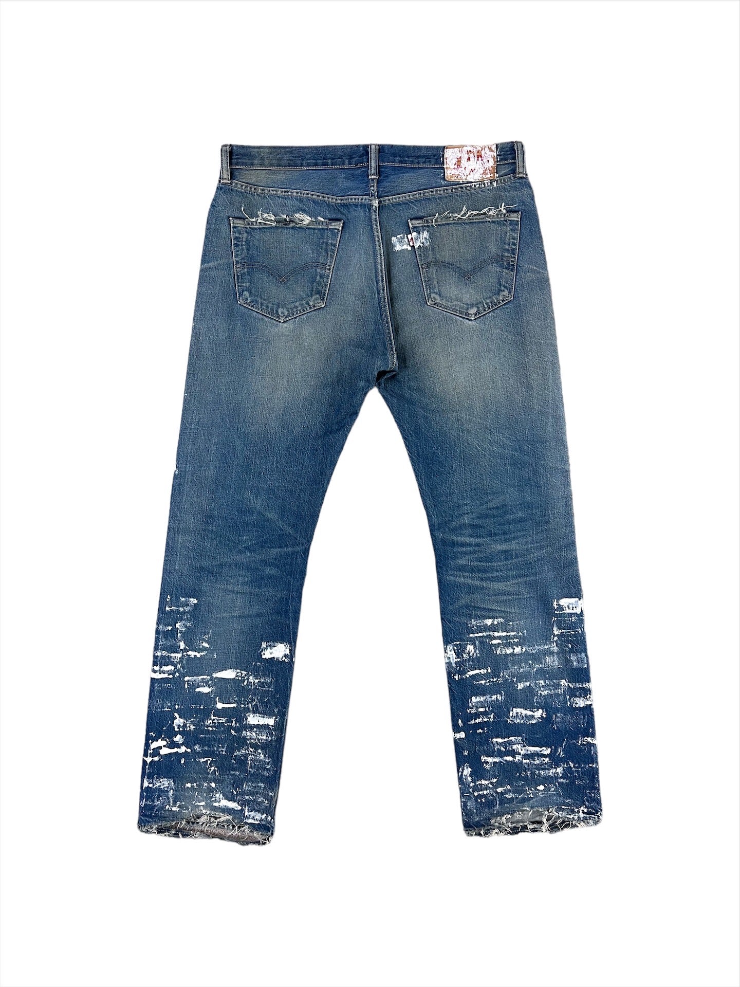 Ho rielaborato questo jeans eseguendo a mano una lavorazione painted con colore bianco da tessuto di alta qualità.